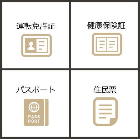 運転免許所、保険証、パスポート、住民票など